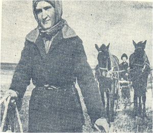Более 1,5га скошенного хлеба связывают колхозницы Савченко Пелагея, Трощенко Евдокия, Семирюк Ирина, Поэглакан Анна. Многие женщины колхоза связывают хлеб с 90 соток при норме 50. Мельникова Валентина, Загумённая Пелагея и Лихолит Матрёна (у всех троих мужья в Красной Армии) подрабатывают зерно на клейтоне. Не останавливая машину ни на минуту, эти колхозницы пропускают в день по 200ц вместо 100ц по норме».11