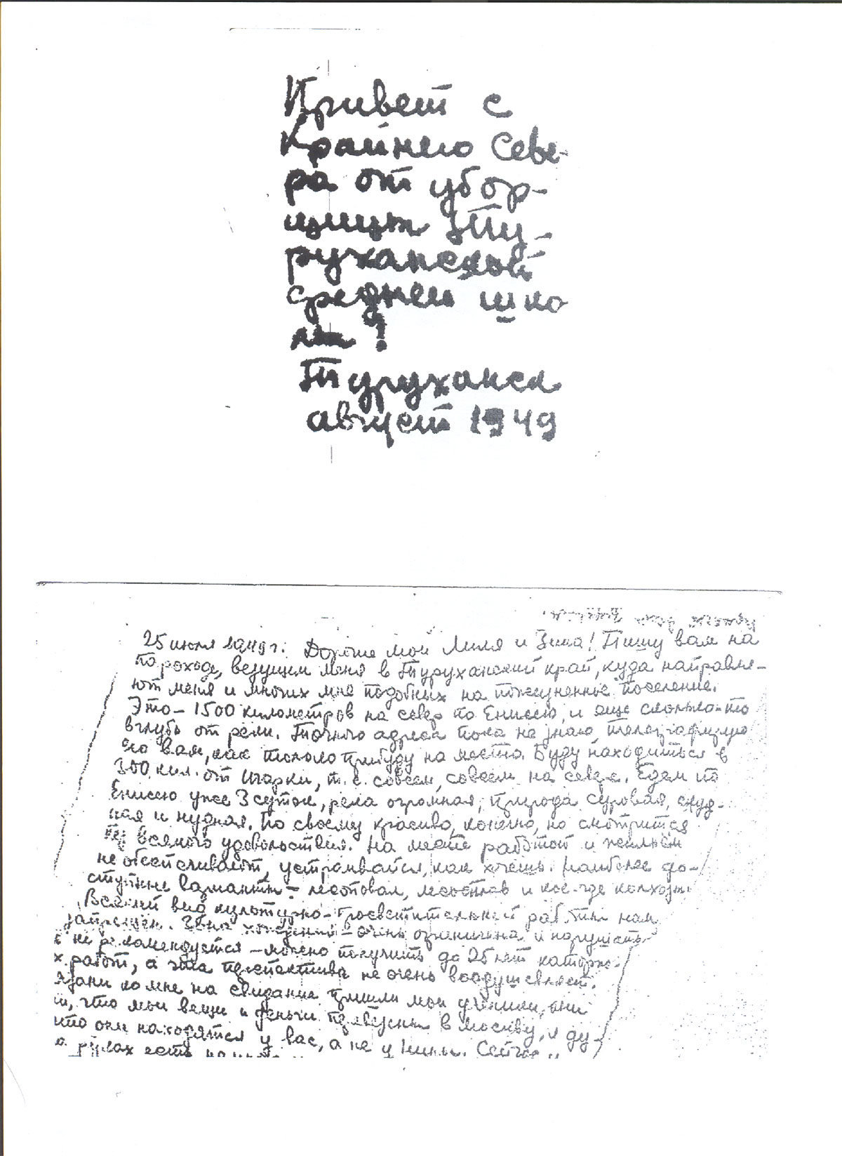 В Туруханске было объявлено, что тот, кто найдёт здесь работу, останется, а остальных отправят далее на Север. Ясно было, что там ожидало: строительство железной дороги, лесоповал, рыболовецкие колхозы (приложение 1, лист 2). Везде невыносимый по тяжести физический труд. К тому же страшила перспектива остаться отрезанными от почты, телеграфа, газет.