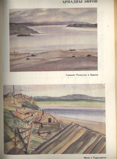Я попыталась представить себе это плавание. В книге А. Шкодиной написано, что лодка отплыла от берега Енисея. Её подруга спустилась к Енисею с поляны, называемой в народе «Беседой» , потому что там проходили гулянья. Но старожилы показали мне место, где была «Беседа». (Эфрон, А. Устные рассказы/Эфрон А. Мироедиха: Рассказы. Письма. Очерки. Федерольф, А. Рядом с Алей: Воспоминания..-М.:Возвращение, 199,С.236) Это место было расположено на высоком берегу Нижней Тунгуски, а не Енисея, и было смыто наводнением 1959 года. Встав на краю обрыва, я увидела огромную водную гладь. Туруханск расположен на слиянии двух больших сибирских рек – Нижней Тунгуски и Енисея. Здесь ширина водных просторов достигает почти трёх километров (впоследствии на одной из акварелей А.С. Эфрон изобразит эту водную ширь, так потрясшую её и подругу). Лодке, на которой плыла Ариадна Сергеевна, нужно было проплыть до слияния, обогнуть остров Монастырский и огромную мель за ним, доплыв до противоположного – левого – берега Енисея, и затем подняться против течения вверх по Енисею на 30 километров. Путь неблизкий и опасный, реки неспокойные, а Ариадна Сергеевна, оказывается, плохо плавала и очень боялась воды. Я попыталась взглядом проследить возможный путь лодки и поняла, какой ужас испытала сама Ариадна Сергеевна и её подруга, увидевшая Алю в отплывающей перегруженной лодке с заглохшим мотором, в руках у неё – банка для вычерпывания воды. Возможно, они мысленно прощались друг с другом.