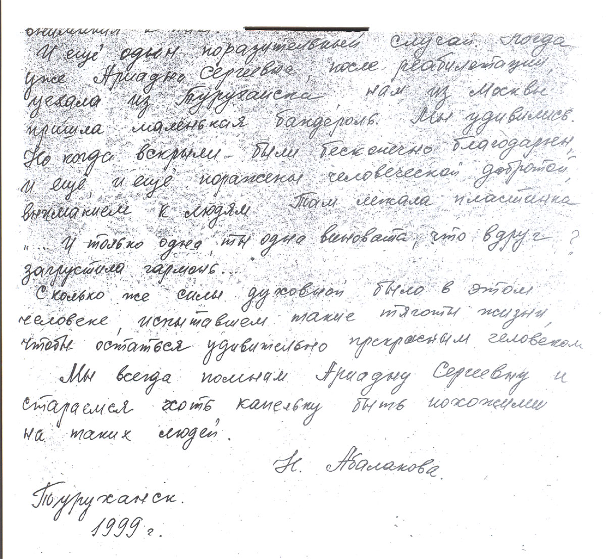 В моей работе обстоятельства приезда в Туруханск и устройства на работу изучены по переписке Ариадны Сергеевны с Б.Л. Пастернаком и книге А.А. Шкодиной (Федерольф) «Рядом с Алей». Непосредственно туруханская ссылка и особенно работа Ариадны Сергеевны в районном Доме культуры описаны со слов местных жителей, работавших с ней в ДК, а также жителей бывшей деревни Мироедихи Туруханского района, куда А.С. Эфрон ездила на сельхозработы в помощь колхозу. Отказалась делиться воспоминаниями (да и не только с нами) семья Силкиных – потомки «бабки Зубарихи». Думаю, что причина в том, что проживание на квартире «бабки Зубарихи» описано очень негативно, а семья Силкиных с этим не согласна. Очень жаль, ведь было бы интересно сопоставить разные взгляды на одни и те же события. Две дворянки заброшены в нечеловеческие условия. Но это для них они были нечеловеческими, а местные жители именно так и жили: тяжело – материально и скудно – духовно. Отсюда, возможно, и несовпадение впечатлений ссыльнопоселенок и родственников хозяйки домика.