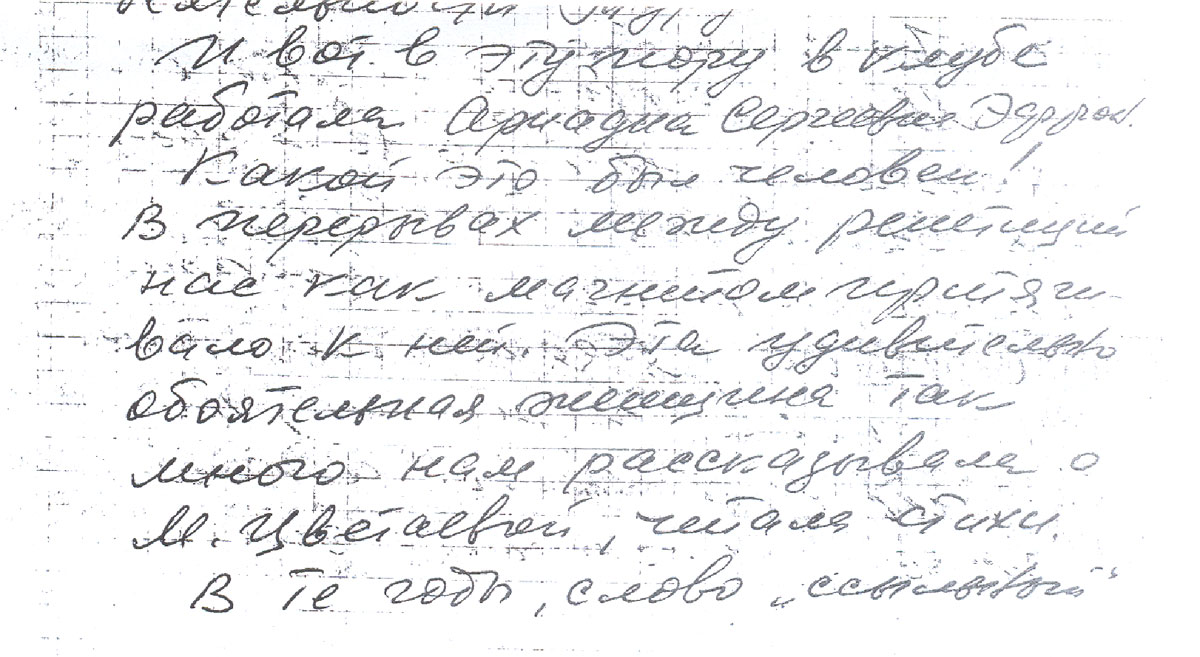 Уже в этих двух эпизодах (поиски работы и отъезд в Мироедиху) я увидела замечательные черты характера Ариадны Сергеевны: она не жаловалась, «только ещё больше бледнела и замыкалась», она не говорила о переполнявших её, вероятно, чувствах, но в ней была внутренняя сила и решимость, которые помогали ей выжить.