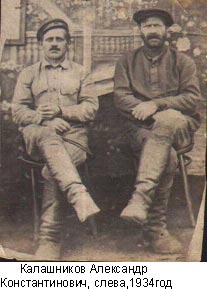 5. Наш предок Константин Кондратьевич Калашников. Родился 14.09.1849 года. Крещен 18.09. в Петропавловской церкви. Восприемниками при крещении 18.09. были крестьянин Савелий Калашников и деревни Уярской девица Варвара Ивановна Андреева (метрические книги Рыбинской Петропавловской церкви;Красноярский крайгосархив,ф.694.оп.1д.667.л.21.) Проживал в с. Рыбинское, занимался крестьянским хозяйством. Имел 35 га земли под обработку, хлев, конюшню, баню, жатку, веялку, 4 плуга, 6 борон. Скотина- 25 лошадей, 18 коров, 8 волов, 2 быка, 35 овец, 8 свиней. По словам родственников, отличался крутым нравом (см. воспоминания внучек Александры и Елизаветы). Умер примерно в 1924 году. Похоронен на кладбище на горе, на месте которого потом построили клуб.