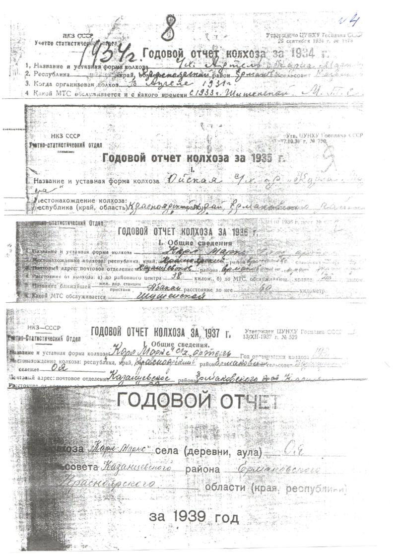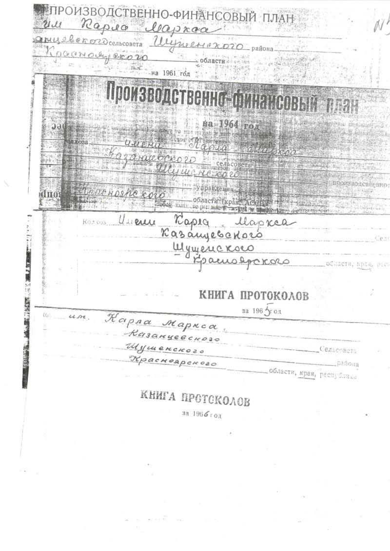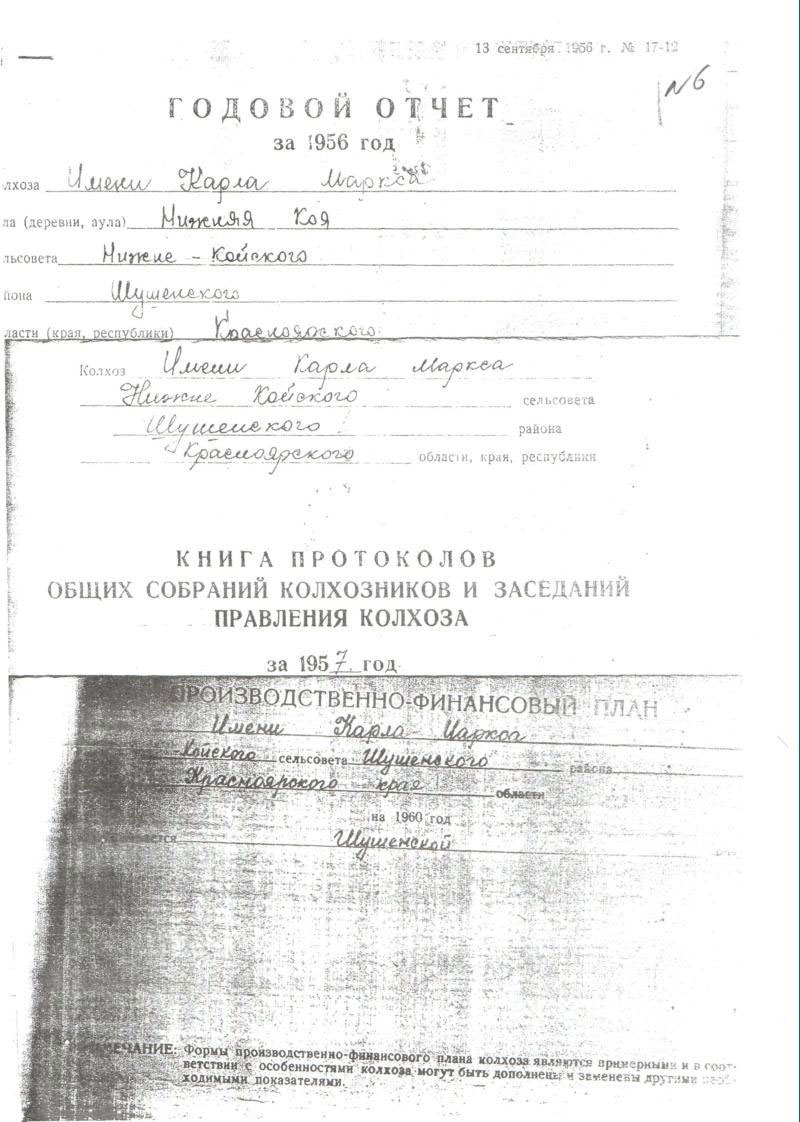 О колхозе им. Карла Маркса мы нашли информацию, которая всех наших сомнений не разрешила. Хозяйство с таким названием существовало в двух территориях: в селах Оя и Нижняя Коя. В селе Оя колхоз был образован в 1931 году и просуществовал до самого вхождения в колхоз «Енисей»в 1964. (4),(11) О дате образования колхоза им. Карла Маркса в селе Нижняя Коя мы не располагаем информацией. У нас есть документы о производственно-финансовых планах этого колхоза за 1959-1960гг., относящемуся к Нижне-Койскому сельсовету. Последний, по нашему мнению, с 1961 года был введен в состав Казанцевского сельсовета в результате его укрупнения. По документам, находящимся в нашем распоряжении, колхоз им. Карла Маркса в Нижней Кое существовал и в 1966 году.(6)