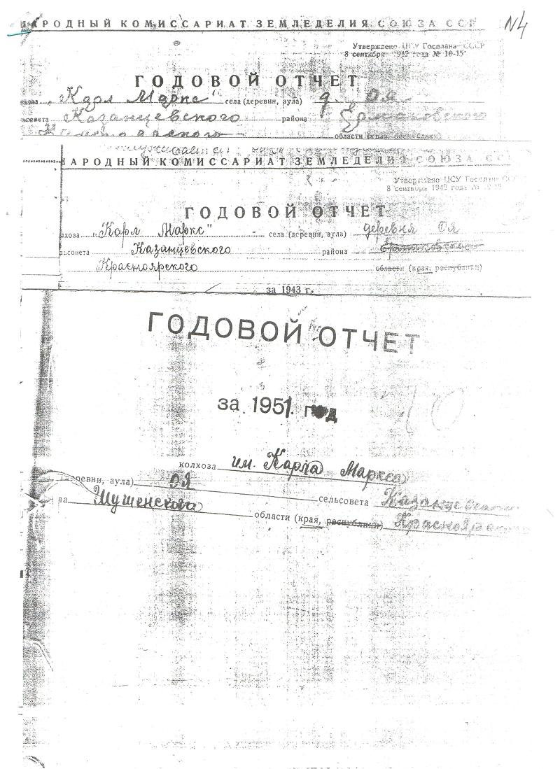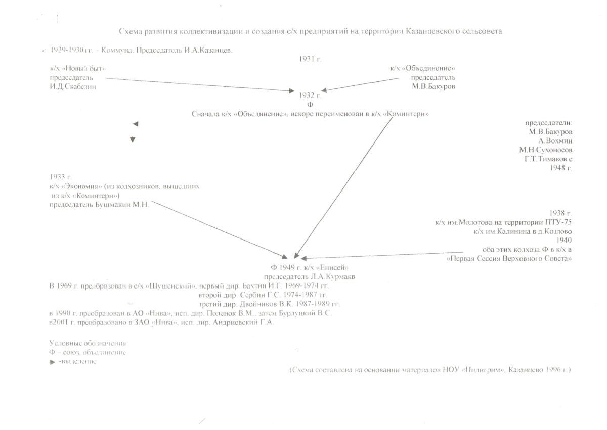 В своей схеме Денис показывал, что к/х «Енисей» был образован в 1949 году, в результате слияния трех к/х: им. Первой Сессии Верховного Совета СССР, «Экономии» и «Коминтерна». У нас есть все основания поправить эту схему. К/х «Енисей» получил свое название в 1957 году путем переименования его из колхоза им. Молотова. Из старых изысканий мы знаем, что совхоз «Шушенский» появился в1969 году в результате преобразования колхоза «Енисей», в который и вошли в 64-ом году все выше названые колхозы так как к/х «Енисей» регистрировал свой, вероятно, новый устав, в Исполкоме Шушенского района 14.12.1964 года, к/х им. Карла Маркса вошёл в 1966 году, так как имеются колхозные документы, датированные этим годом. (11)
