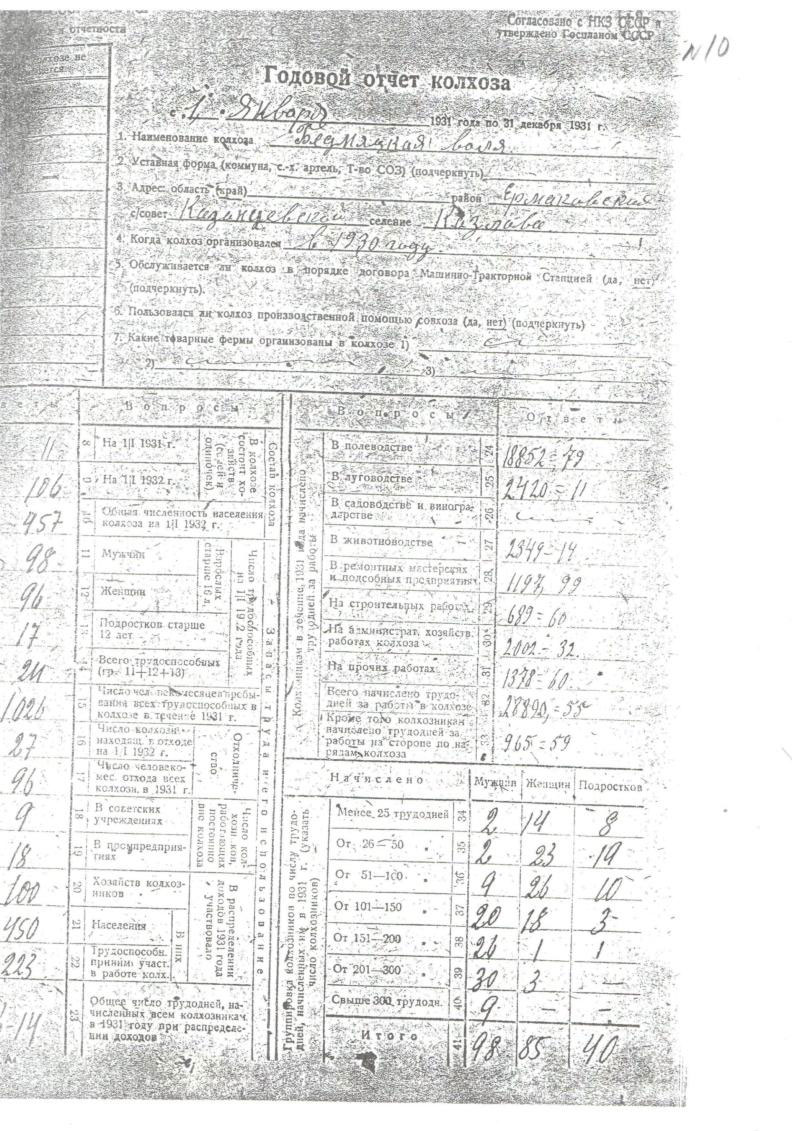10. Годовой отчет (лицевой лист) к/х «Бедняцкая воля», Шушенский гос. архив,