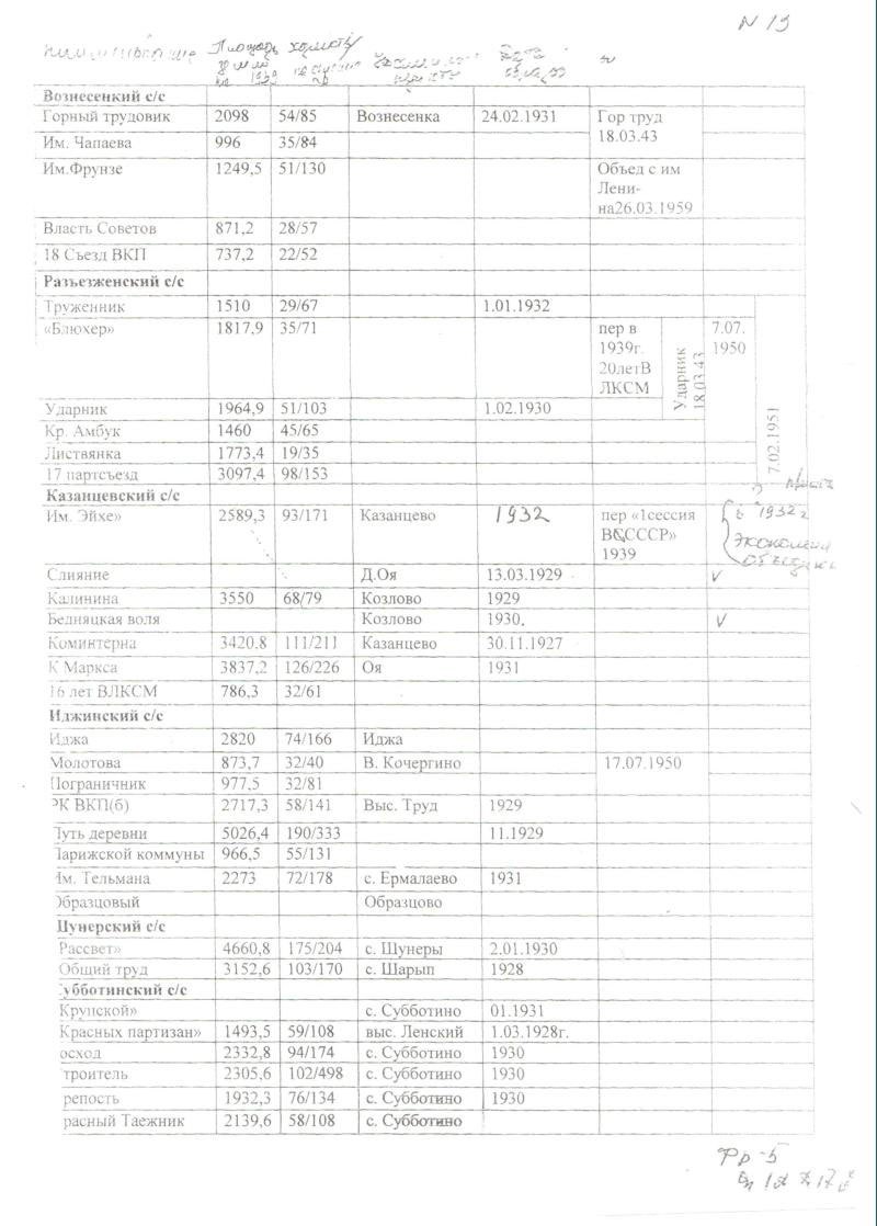 Работая в Ермаковком архиве, мы воспользовались черновыми набросками к будущей книге энциклопедического характера по истории юга Красноярского края, над которой работает заведующая Ермаковским Государственным архивом Чеховская Н.А.(13) Она, исследуя материалы фонда 5, описи 1 «а», дела 17, составила перечень колхозов, входивших в Казанцевский сельский совет, в котором показано, что колхоз им. Коминтерна был образован 30.11.1927 года. Таким образом, очевидна ошибка в схеме Дениса, который показывал, что «Коминтерн» образован в 1932 году.