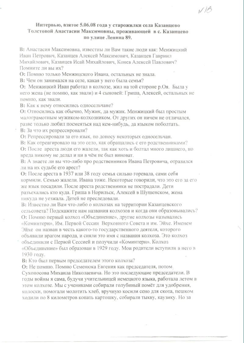 16. Интервью, взятое 05.06.08г. у старожила села Казанцева Толстовой А.М.;
