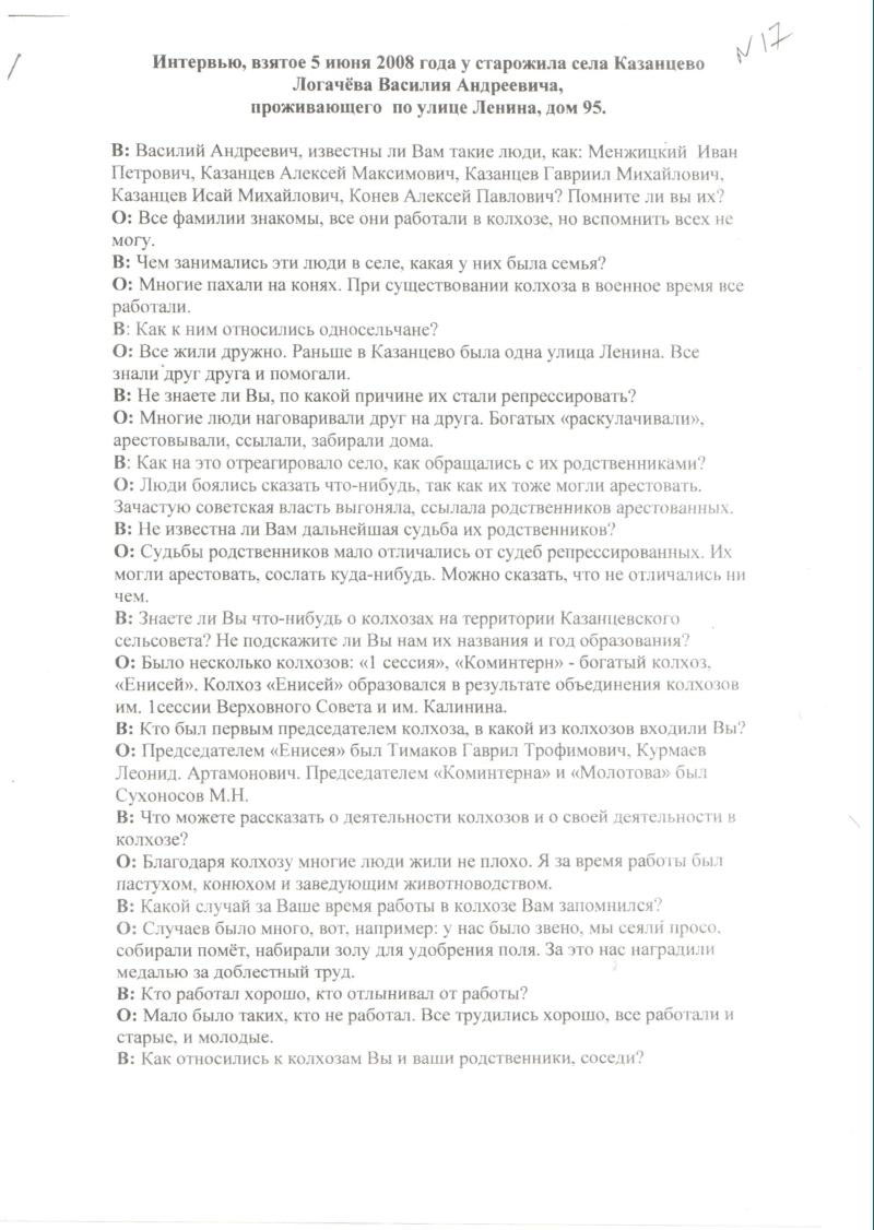 17. Интервью, взятое 05.06.08г. у старожила села Казанцева Логачева В.А.;