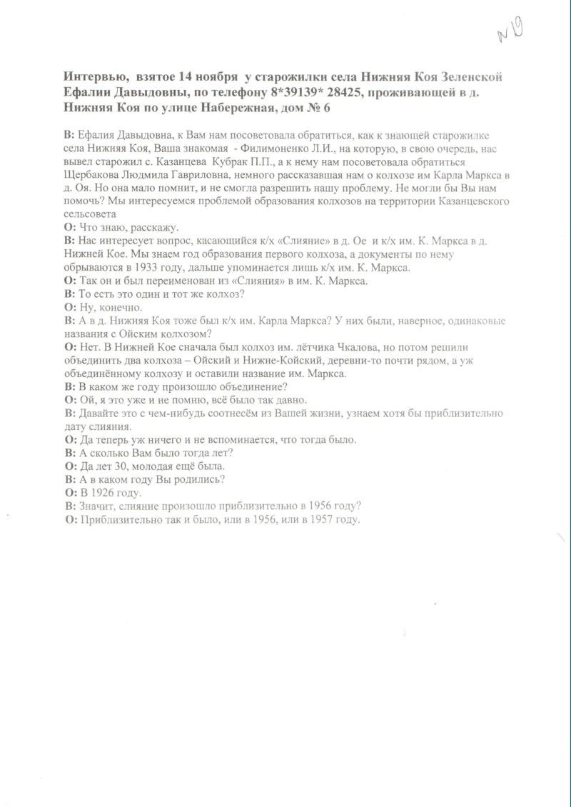 В результате наших изысканий к нам попала информация о колхозе «Слияние», существовавшем в селе Оя с 1929 года. (8)Документы об этом колхозе обрываются в 1933 году. Можно предположить, что он вошел в окрепший колхоз им. Карла Маркса в этом же селе. Рассматривая карту территорий, входящих в Казанцевский сельский совет, мы обнаружили, что село Оя располагается рядом с селом Нижняя Коя. Логично предположить, что колхоз им. Карла Маркса в д. Ое и д. Нижней Кое представляет собой одну и ту же организацию. Поиск привёл нас к старожилке села Нижняя Коя Зеленской Ефалии Давыдовне, с которой мы общались по телефону. Она подтвердила наши догадки: к/х «Слияние» в д.Оя был переименован в к/х им. Кала Маркса в 1933 году. Приблизительно в 1956 году, когда нашей респондентке было около 30 лет, произошло слияние к/з им. К. Маркса из д. Оя и к/х им Чкалова из д. Нижняя Коя, общее название колхоза стало им К.Маркса. (19)(21)
