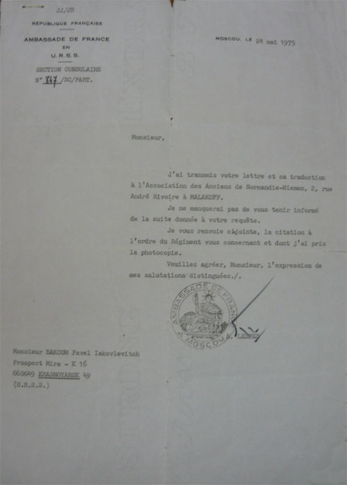 Копия письма Посольства Франции в России Павлу Яковлевичу Бакуму