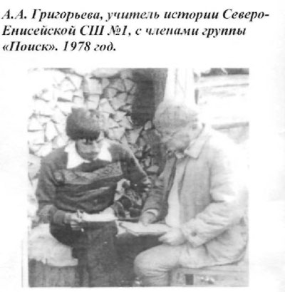 Активную помощь оказывали и оказывают поисково-краеведческой работе директор Дома Творчества Т.Н. Горожанина, начальник Северо-Енисейского отдела госбезопасности Г.Фролов, военные комиссары В.Горельцев, А.Еремеев, Д.Щербинин, Р.Тучин.
