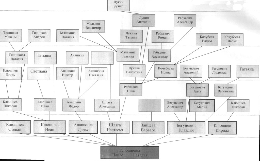 Моя прапрабабушка, Кудрявцева Наталья Борисовна, родилась около 1876 года, в Белоруссии, недалеко от города Хатынь. Рано осталась без родителей, воспитывалась теткой. Была она красивой и статной, а косы такие, что многие завидовали. По совету тетушки вышла замуж за вдовца, у которого было трое детей. Тетушка ей говорила: «Иди, Наталья, за Панаса Клюшнева, у него хоть и трое детей, зато есть земля». Она вышла замуж не по любви, а по расчету, но никогда об этом не жалела. Панас Федосович оказался спокойным, уравновешенным, хозяйственным и как сейчас говорят без вредных привычек. В детстве он тоже рано остался без родителей и был поводырем у слепых. Жил на то, что ему дадут в деревнях, по которым он водил слепых. Однажды он сильно заболел и, наверное бы, умер. Но его взяла к себе зажиточная женщина, у которой к тому времени не было мужа и была она бездетной. Панас всю жизнь вспоминал, как она налила большую бадью теплой воды с травами, обрила его наголо, всю его ветхую одежду сожгла в печи. А его посадила в эту бадью и долго парила. После этого дала чистую одежду. Эта женщина его выходила, но с тех пор Панас не мог полностью поднимать руки и поднимал их только до уровня плеч. Так уже взрослым Панас обрел семью, а после смерти той женщины все ее имущество досталось ему в наследство. К сожалению, прапрадедушка редко вспоминал свое детство, и дети не запомнили, как звали ту удивительную женщину.