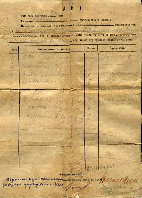 В 1941 г. нас сослали. Взять с собой разрешалось только самое необходимое: еду и одежду - 36 кг на человека. На дом нам дали расписку, написанную карандашом, без подписей и печатей.