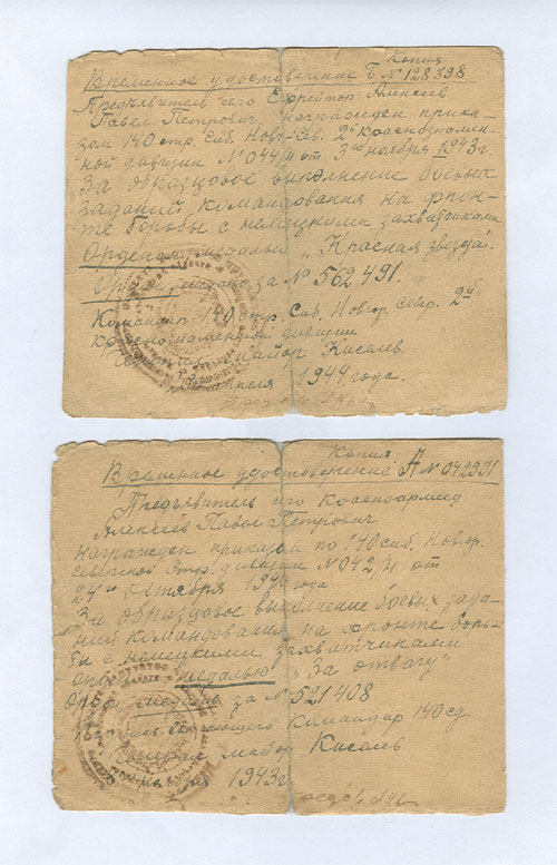 Временные удостоверения на награды Алексеева Павла Филипповича,