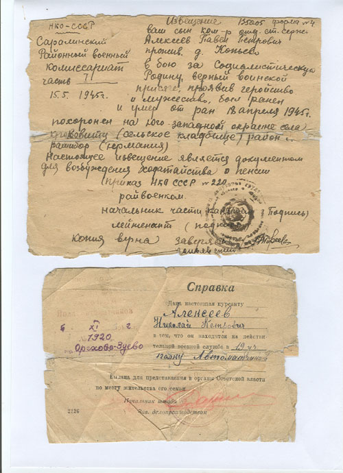 Извещение о его смерти. Справка Алексеева Николая Филипповича о службе в учебном