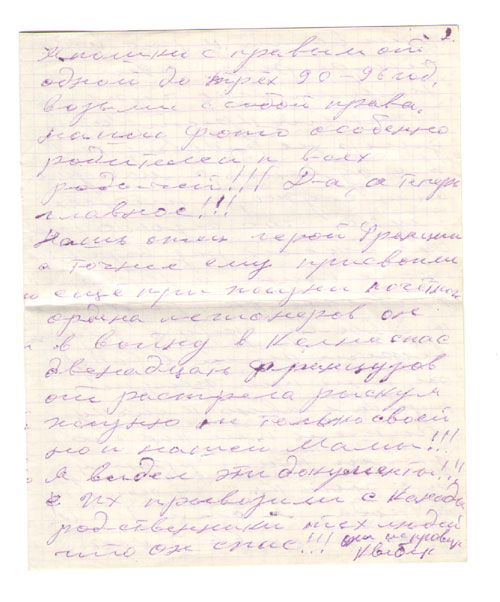 Из письма отца старшей сестре, отец пишет: «Наш отец герой Франции, а точнее ему присвоили еще при жизни почетного ордена легионеров.… Умер не рядовым, как все думают, а майором спецслужбы госбезопасности…»