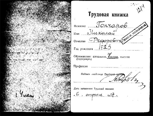 Трудовая книжка Н.Ф. Гончарова, которая свидетельствует о том, что он был