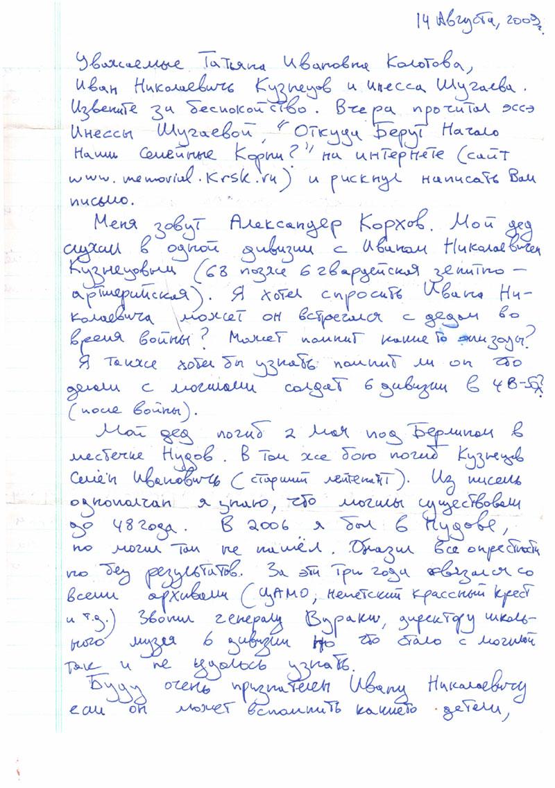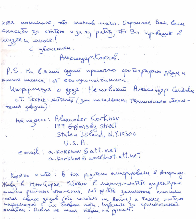 К сожалению, дедушка не смог сам ответить на это письмо, так как он скончался после долгой и продолжительной болезни, но мы ответили Александру Корхову и отправили ему фронтовые фотографии , на одной из них есть его дедушка. Вот таким образом война напомнила о себе почти 65 лет и объединила наши семьи.