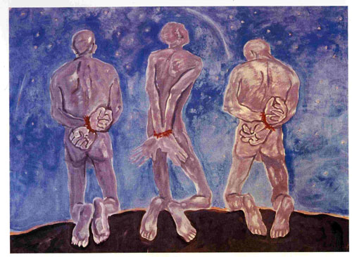 Три обнаженные мужские фигуры со связанными руками стоят на коленях перед