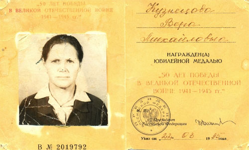 Кузнецова Вера Михайловна закончила пять классов на отлично, когда началась война. Отец был призван на фронт в августе 1941 года, а в феврале 1942 года пришла похоронка, в которой было написано, что ее отец Глубоков М.В.пропал без вести под Ленинградом. Полгода скрывала она от матери эту страшную весть, потому что она сильно болела, отнялись ноги. И пришлось Вере в пятнадцать лет быть в семье за хозяина, ведь было на ее иждивении три сестры Надя, Маша и Клава. Как не горько было на душе, а надо было работать и кормить семью. Помогал дедушка, который ловил рыбу и им приносил. Вера работала в колхозе имени Сталина звеньевой. Приходилось вставать в шесть часов и идти назначать на работу колхозников. В звене работали старики, женщины, подростки, всего тридцать человек. С ней работали Гвоздева Екатерина, Кузнецова Евдокия, Понкратова Анна, Сайдачаковы Мария и Петр, Понкратова Анна, Ликум Владимир, Мария, Афанасий, Иван, Лопатин Виктор. Весной сеяли пшеницу, овес, просо, лен, коноплю. Летом косили сено, потом складывали в копны, осенью возили на корм скоту. В уборочную страду пшеницу косили лобогрейками, жали в снопы серпами. Норма была пятьсот снопов. Всегда норму выполняли и перевыполняли ее.