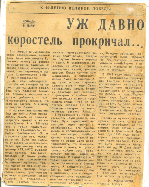 В газетной статье «Уже давно коростель прокричал» рассказывается о Гопоненко Анне Анисимовне, которая в годы войны работала на тракторе вместо мужчин, ушедших на фронт.