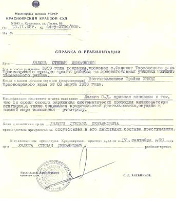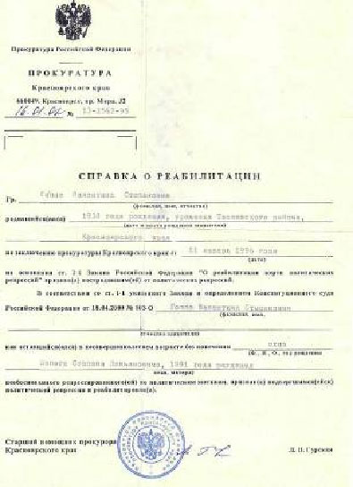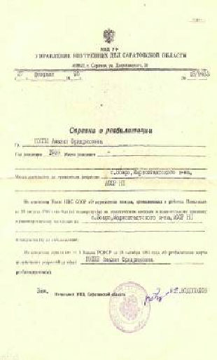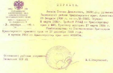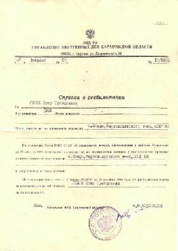 Справки о реабилитации пришли нам из УВД Саратовской области, семья долгое время думала, что умер прадед в Свердловской области и только в 2007г при поиске материала в Интернете мы нашли сведения о нем на сайте.