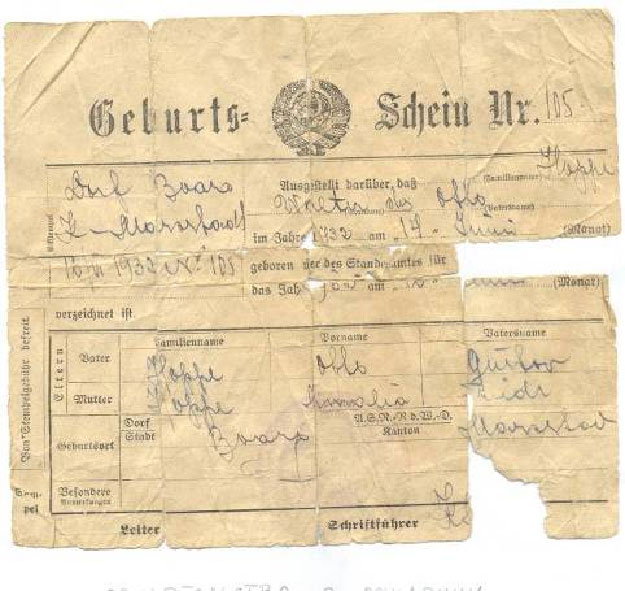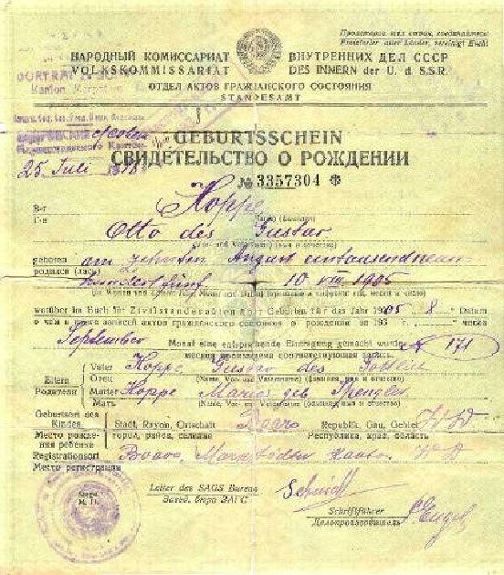 Свидетельство о рождении моего деда Гоппе Владимира(Вальтера) Оттовича