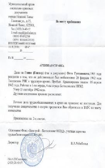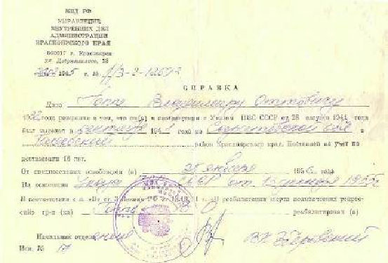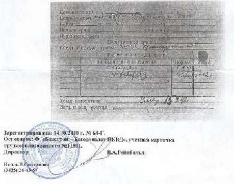 Из телефонного разговора с заведующей архива Рейнбольд В.А.: « Какая фотография? Какое личное дело? У меня у самой свекор немец, личное дело заводилось только на тех, кто сидел в тюрьме. Немцы были не заключенными, все что на них заводилось – это учетная карточка, где с их слов были записаны фамилии, часто с ошибками, т.к. многие из них не говорили по- русски».