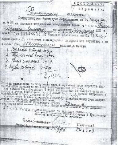 Родилась дочь Таисия. Они уехали жить в д. Шигашет, где отец устроился работать пчеловодом. Нужно было жене оформить паспорт, за этим он и пошел в Тасеево, там его и арестовали по приговору тройки НКВД. Нам сказали, что он отправлен на Новые Земли без права переписки на 10 лет. В 60-ые нам сказали, что он там умер, и дали за него по отрезу на платье. Его забрали в феврале, а я родилась в мае (Приложение №3). Когда в 90-ые годы начался процесс реабилитации, вот тогда-то мы и узнали, что после ареста он сразу был расстрелян в г. Канске за контрреволюционную агитацию. Мама до этого не дожила, умерла в 1985г. Но она нам рассказывала, что он был малограмотный и стеснительный, если что-нибудь нужно было у соседей попросить, то всегда отправлял маму».