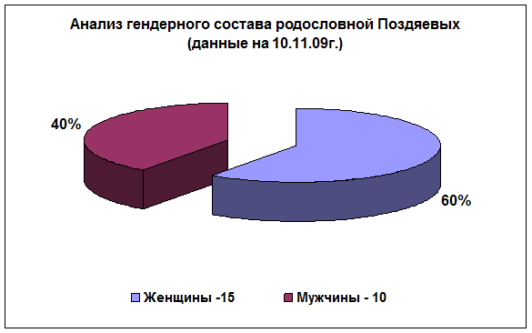 Мы провели анализ гендерного состава «норильской ветви» рода Поздяевых (имеются ввиду только те потомки, которые непосредственно проживали или проживают на сегодняшний день в городе Норильске). Всегда считалось – по численности преобладает женский пол. Анализ подтвердил эту гипотезу.