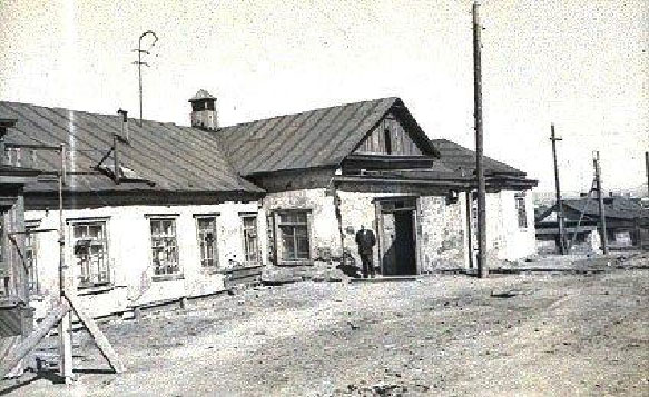 28.Бывший лагерный барак. Около входа стоит автор мемуаров И. Сибиряк. Фото 1960 г. сделано перед отъездом семьи Сибиряк из Норильска