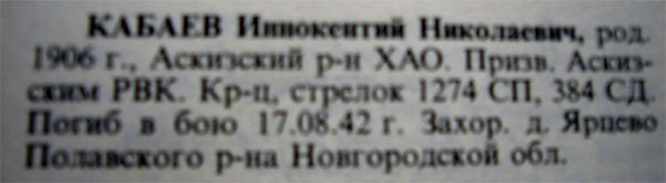 Все пятеро сыновей Кабаевых были призваны на войну: старшие, Андрей и Степан, из Абаканского военкомата, а Иннокентий, Василий и Никонор – из Аскизского. Вернулись только трое: Андрей, Василий и Никонор.