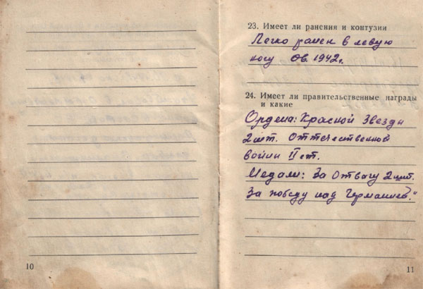 В июне 1942 года был легко ранен в левую ногу. В «Военном билете» в графе о правительственных наградах сделана интересная запись: «Ордена: Красной Звезды – 2 шт. Отечественной войны II степени. Медали: За отвагу 2 шт. За победу над Германией». Интересно то, что ордена и медали, оказывается, можно штуками измерять, как какую–нибудь обыкновенную вещь или же продукт.