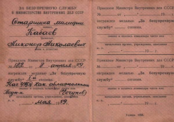 В архиве Кабаевой Раисы Васильевны сохранились фотографии, паспорт, выданный в 1951 году, военный билет, орденская книжка и удостоверение к медали «За безупречную службу».