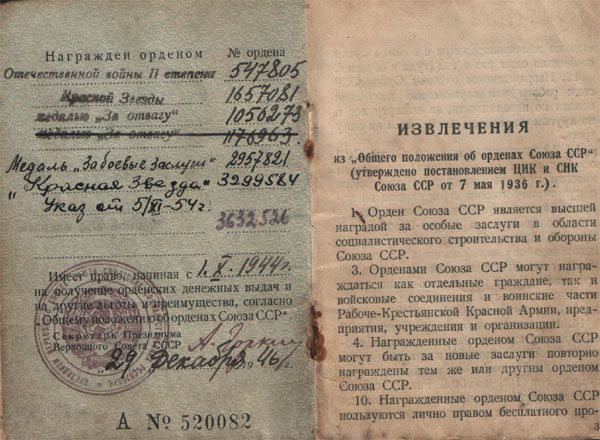 В «Орденской книжке» почему-то вторая медаль «За отвагу» зачёркнута. За