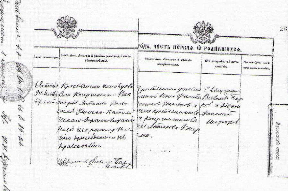 Так, за активное участие в Польском повстанческом движении в 1830 году, направленном против русского царизма за свободу польского народа и независимость Польши, был арестован и сослан в Восточную Сибирь на десятилетние каторжные работы с пожизненным поселением Вольский Вацлав. В 1840 году Курагинским волостным правлением направлен в село Кочергино Минусинского уезда. В 1845 году к Вацлаву Вольскому из Польши приехали жена и дети. Основным занятием Вацлава Вольского (1805-1875), выходца из мелкопоместного польского дворянства, в Кочергино было земледелие, возделывание и разведение новых, наиболее плодородных сортов зерновых и огородных культур. Умер он в преклонном возрасте и похоронен на кочергинском погосте. Живя в Сибири, поляки из католичества переходили в православие, о чём свидетельствует запись из метрической книги [Приложение 1]. Мне удалось побеседовать с дочерью потомка Вольского Вацлава, Ираидой Николаевной Гора. Вот что она рассказала: «Моего деда звали Яковом Алексеевичем Вольским, бабушку – Анастасией [Приложение 2]. Дед с бабушкой были грамотными, жили зажиточно. У них была земля, где они сеяли хлеб, хозяйство, скот, лошади. В 20-х годах их раскулачили». И действительно, посетив Минусинский государственный архив, я нашла документы по раскулачиванию граждан Кочергинского сельского совета. Фонд № 275, опись 3, дело 46, на странице 16 запись: «Из именного списка кулаков и их семей, высланных из Кочергино Кочергинского с/с Минусинского района 12 мая 1931 года: Вольский Яков Алексеевич 50 лет, Анастасия Александровна 49 лет, Николай 12 лет, Галина 18 лет, Нина 16 лет, Анфуза 15 лет, Вера 4 года, Валентина 8 лет». Больше никаких документов в архиве не нашла. В «Книге памяти…» удалось найти сведения о Якове Алексеевиче (на странице 235): «Вольский Я.А. – уроженец и житель с. Кочергино Минусинского округа Енисейской губернии, из крестьян-кулаков, грамотный. В 1930 году раскулачен, выслан, из ссылки бежал. Работал в колхозе «Ранний восход». Вновь арестован 25.11. 1937 г. Обвинён в контрреволюционной агитации, террористической деятельности. Осуждён 4 декабря 1937 года тройкой УНКВД Красноярского края на 10 лет исправительно-трудовых лагерей. Реабилитирован прокуратурой КК (П-17775) 8 сентября 1989 года».