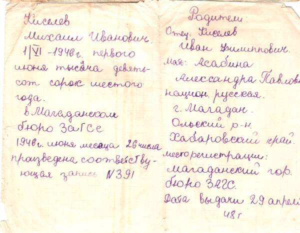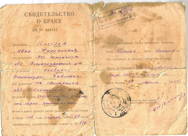 Свидетельство о браке Ивана и Александра Киселёвых, Магаданский ЗАГС.1948 г.