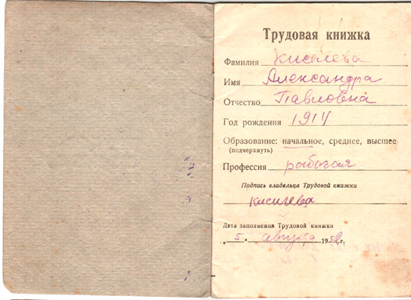 Трудовая книжка Киселевой Александры Павловны