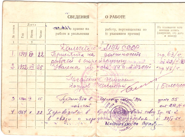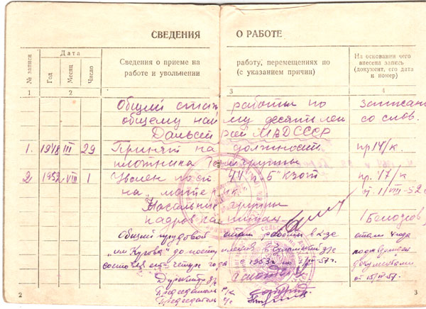Трудовая книжка Киселёва Ивана Филипповича, 2-я страница с надписью Дальстроя