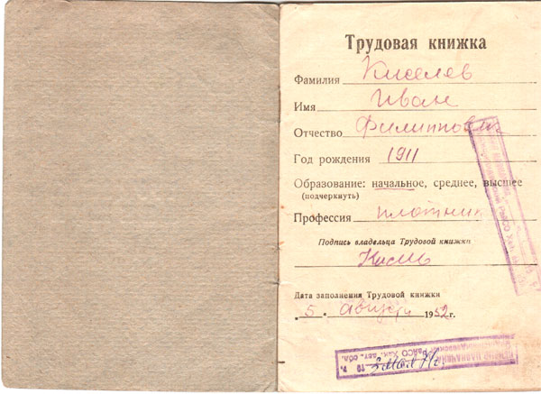 Трудовая книжка Киселёва Ивана Филипповича, плотника, выдана 05.08.1952 г.