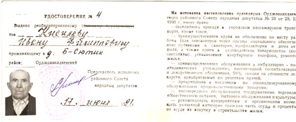 Удостоверение № 4, выданное Ивану Филипповичу о его реабилитации от 17.06.1991