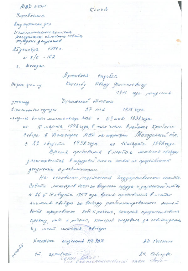 Архивная справка о нахождении в местах лишения свободы Киселёва Ивана