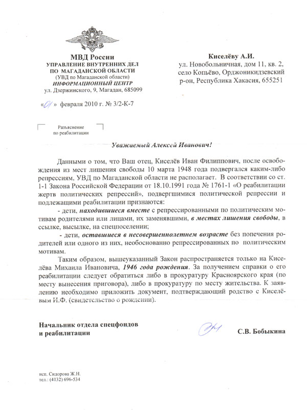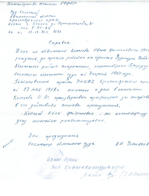 Справка о реабилитации Киселёва Ивана Филипповича, выданная