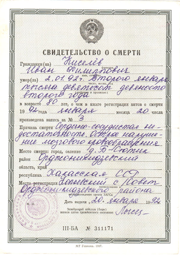 Свидетельство о смерти Киселёва Ивана Филипповича.