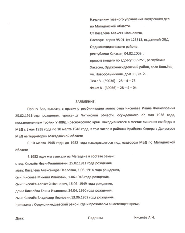 Разобраться в моей родословной мне помогли мой дедушка Михаил Иванович Киселёв, проживающий в нашем селе Копьёво, моя прабабушка Мария Филипповна Киселёва (ныне Бабенко) – родная сестра моего прадедушки Ивана Филипповича Киселёва, проживающая в соседнем посёлке Копьёво, моя мама Киселёва Виктория Михайловна, другие родственники. Помогли своими воспоминаниями, поделились тем, что хранили в своих домашних архивах: фотографиями, документами, вырезками из газет. Я обратилась к Книге памяти жертв политических репрессий по Республике Хакасия, но, не найдя имён родных, отыскала Интернет- сайт с их именами. Интернет мне помог понять и то, что такое Дальстрой, масштабы репрессий.