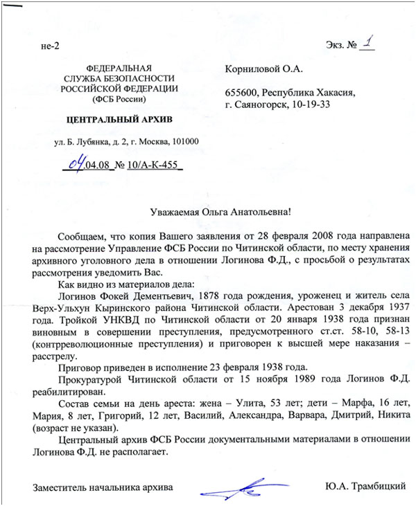 В данной работе речь пойдет о моем прапрадеде Логинове Фокее Дементьевиче, который проживал в с.Верхний Ульхун, Читинского округа. В ходе массовых репрессий он был приговорен к расстрелу.