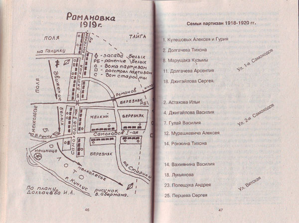 В книге И.А.Долгачева «Мы сурового времени дети» в части 3 «Полыхает гражданская война», стр. 36-97, события гражданской войны в Прикунгусье представлены более подробно – 60 страниц. Сам автор не участвовал в войне, был подростком (1904 г. рождения), но летописцем оказался неплохим. «В своем очерке положил в основу воспоминания бывших партизан…, к тому еще и то, что видел сам» (стр.42). Долгачев нарисовал план д. Романовка, на нем изображены три улицы: Вятская, 1 и 2 Самоходов. Обозначены все дома, их 59. Отмечены дома партизан, дан список односельчан, записавшихся в партизанский отряд (14 человек). Указан дом, возле которого расстреляли 4 партизан (приложение 1). Показан путь продвижения белых, их засады. Интересно читать, как подростки посильно помогали партизанам вести разведку и оповещать соседние деревни о приближении карателей.