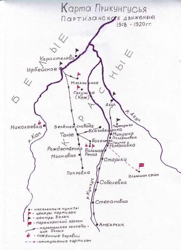 2010 год – год 90-летия со времени окончания Гражданской войны в России. Население Ирбейского района (Ирбейская, Тальская и др. волости), жители Прикунгусья тоже участвовали в ней. Отношение к тем далеким событиям у наших современников разное. Ведь война происходила в одном обществе, внутри одного народа. Как оценить ту борьбу сегодня? На чьей стороне была правда: на стороне белых или на стороне красных? Мы попытаемся ответить на этот вопрос, исследуя события партизанской войны в Прикунгусье.