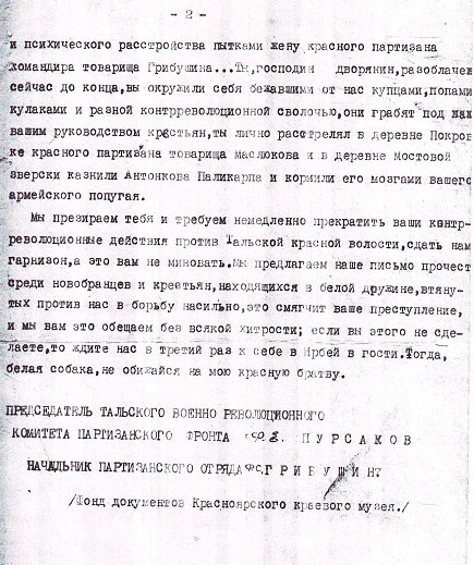 Провокатор ты всесветный, бандит и лакей буржуазии, мы знаем вашу контрреволюционную программу… Ты нас не проведешь, плевали мы на тебя и твое провокационное письмо. Мы презираем вас и вашу колчаковскую опричнину, заявляем… красный партизанский отряд не сдастся, будет драться с вами до победы. … Мы презираем тебя…, предлагаем наше письмо прочесть среди новобранцев…, втянутых против нас в борьбу насильно, это смягчит ваше преступление. Если вы этого не сделаете, то ждите нас в третий раз к себе в гости. Тогда, белая собака, не обижайся на мою красную братву» (И.А.Долгачев, стр. 79-81, приложение 12а). Кроме этого, перечисляются все злодеяния белых, о которых мы уже упоминали. Письмо подписано председателем Тальского фронта Ф.Е.Пурсаковым, начальником партизанского отряда Ф.С.Грибушиным.
