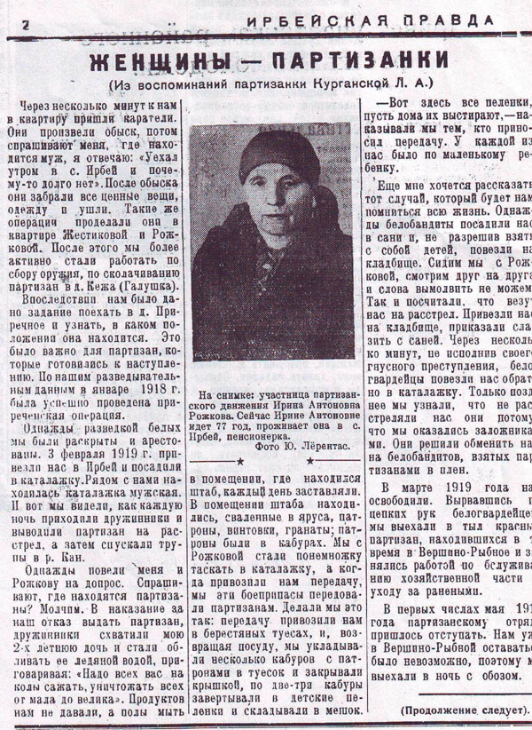 3 февраля 1919 г. меня и Рожкову арестовали белые. Повели на допрос, мы молчали. Тогда они схватили мою 2-х летнюю дочь и стали обливать её ледяной водой, приговаривая: «Всех вас надо на колы сажать, уничтожать от мала до велика». Продуктов не давали, а полы мыть заставляли каждый день. Мы заметили патроны и стали их переносить в камеру. А оттуда, когда нам приносили передачу, переправляли их партизанам. Заворачивали в детские пеленки и передавали. В то время у нас было по ребенку. В марте 1919 нас отпустили. Не успели отойти, как наткнулись на вражеские силы. Я не поспевала за партизанами, т. к. с маленькой дочкой было тяжеловато. Передохнув в заимке, я шла дальше, ища партизан. По дороге дочка заболела черной оспой и умерла. Узнав, где находится штаб партизан, медлить было нельзя. В ту же ночь вместе с подругой Лазаревой Катей мы поехали в д. Истокино. Успев предупредить штаб о подходе белых, мы спасли его» (Ирбейская правда, № 47 от 9.06.1957). Мы уже отмечали о посильном участии подростков в войне. Теперь узнали и об участии женщин. В гражданскую войну были втянуты все слои населения.